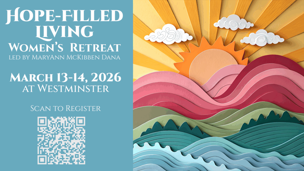 The world can feel overwhelming, and yet hope persists. Join women (16 and older) for a weekend of rest, renewal, and shared discovery. Together we will explore hope both spiritually and practically: the sacred stories that shape our lives and the practices that can set us free for vibrant, hope-filled living. This retreat offers a chance to step away from daily demands, breathe deeply, and reconnect with God’s gifts of strength and possibility. Led by MaryAnn McKibben Dana, pastor, ministry coach, and author of Hope: A User’s Manual, will guide our time with wisdom, warmth, and humor. Click here for more info. Click here to register.