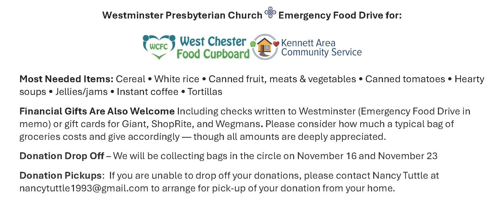 The recent government shutdown and SNAP disruptions left many households vulnerable. We’re continuing to provide support—please help us keep food on their tables. We challenge you to donate at least one bag of non-perishable food in November. Click here for a list of items and instructions. Financial gifts are welcome — checks written to Westminster (Emergency Food Drive in memo) or gift cards for Giant, ShopRite, and Wegmans. We will share all donations between The West Chester Food Cupboard and Kennett Area Community Service (KACS). Together, let’s love our neighbors and help ensure no family in our community goes hungry this season. Bags are available in the church office or in the Narthex on Sunday. Return items by November 23.